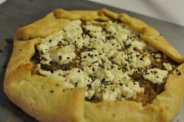 Free form three onion and chèvre tart: