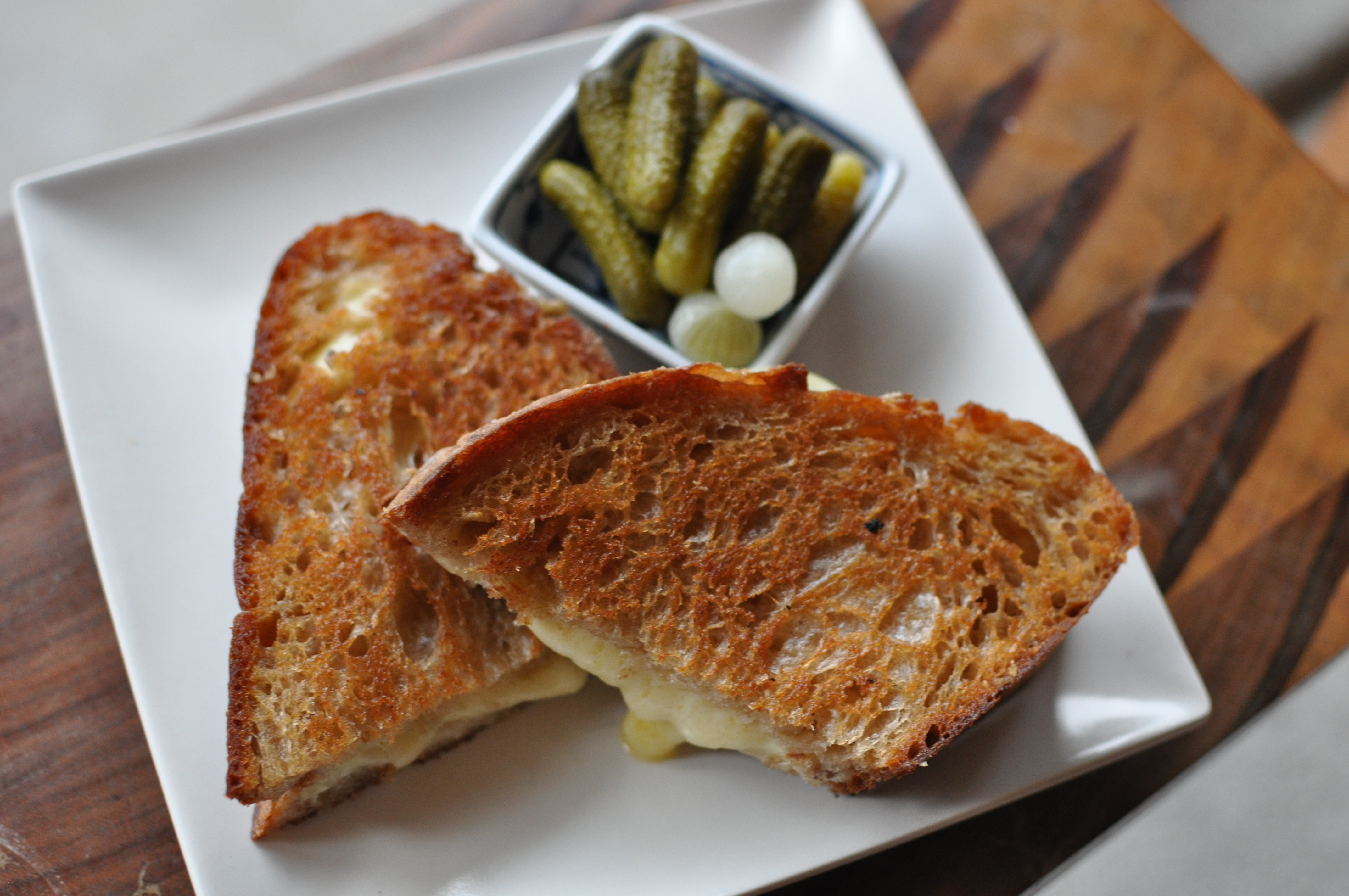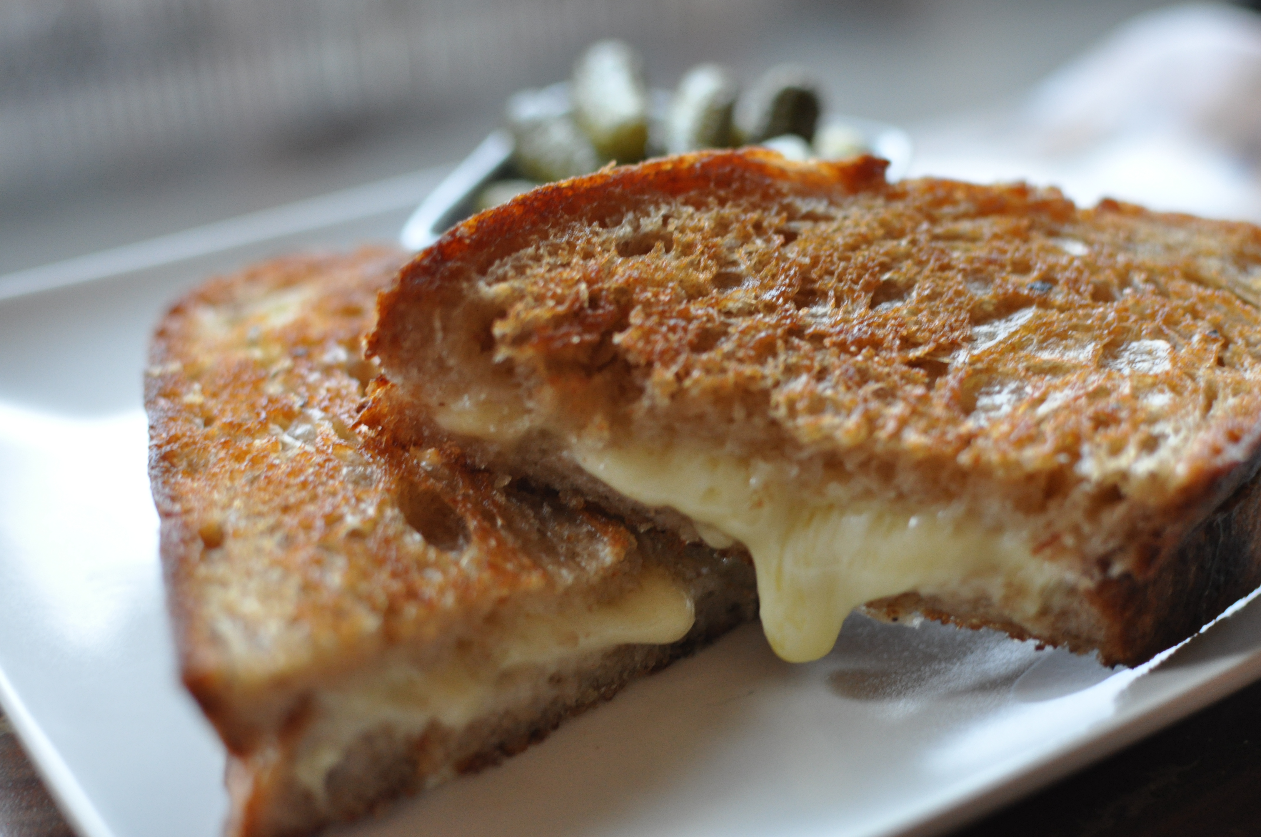 I have been eating a fairly insane amount of grilled cheese sandwiches lately. I was eating them regularly before Ian went away for a week, when he left I ate them for at least 80% of all meals (or pickles in a mug, hummus with a spoon out of the container, etc.) The thing is, it’s pretty difficult to make a terrible grilled cheese, they’re always at least moderately delicious and you can make them out of any end pieces of cheese you might have lying around in your fridge drawer. There are times, however, when you feel like making a grilled cheese that is luxuriously, meltingly, oozingly perfect and this is a fine example of such a grilled cheese specimen. Â Terra Breads in Vancouver makes this quadruple cheese sandwich and serves it with a house made ketchup, since I don’t ever have the foresight to make homemade grilled cheese condiments I eat mine with super vinegary cornichons and Heinz ketchup. I think that this sandwich works best with airy white bread, the bread and cheese seem to become a single unified heavenly substance when exposed to some gentle heat and a pat of butter.