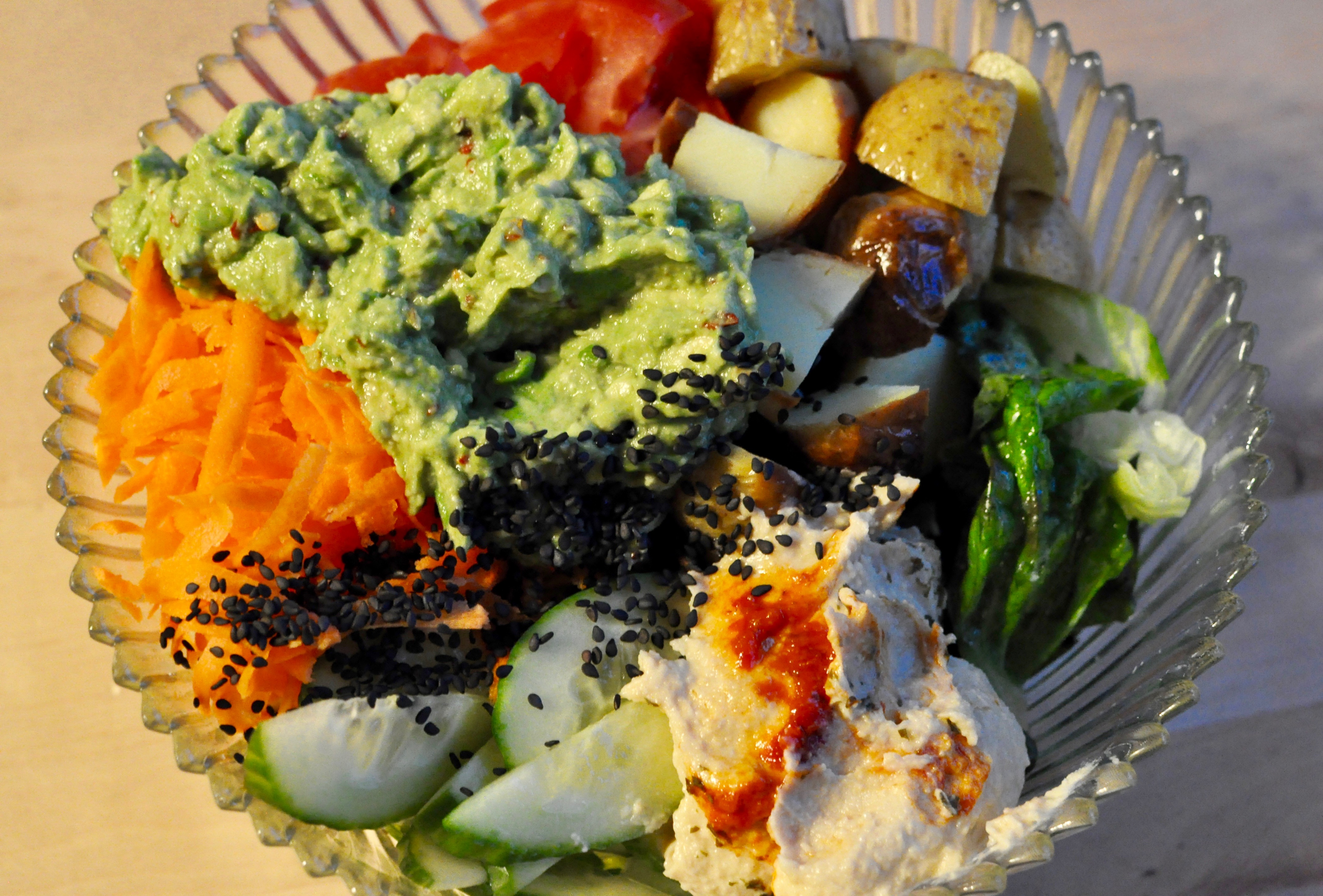 It was only 4:00 when this photo was taken, the light almost completely blinked out on an already dark and rainy day. As I’m sure you can imagine, it’s very difficult to peel yourself off of the couch to go outside, especially when a fireplace, an afghan, and pot of tea are involved. I decided to go out running, meeting my sister in the middle of our respective homes to embark on a further walk down by the water. I hadn’t really anticipated the fact that it was 4 degrees Celsius and pelting rain, my rose tinted windows had apparently given me a cozier weather vignette than was actually true. Despite my resistance to get outside on days like today, I’ve realized how crucial it is for my ongoing mental health and wellness. I actually find the rain a lovely environment for running around in, especially compared to Ontario snow and especially when I have the promise of a long shower and extra soft pajamas in my dresser drawer. When I got home an hour later I was soaked to the bone, slightly exhilarated, and rapidly growing colder.  After a hot shower I made another pot of tea and assembled a kitchen sink salad AKA my favourite kind of salad. If you’ve never made a kitchen sink salad before it’s basically taking all of the relevant salad ingredients out of your fridge and pantry and combining them however you’d like. Leftovers are great for kitchen sink salads, in this case I used up some leftover roasted potatoes, hummus, and guacamole from when I had friends over on Saturday night. All I had to add was some red leaf and iceberg lettuce, chopped cucumber, grated carrot, scallions, tomatoes, black sesame seeds, and a simple lemon and olive oil vinaigrette. I ate this salad wrapped up in fluffy towels and wearing Ian’s LL Bean flannel housecoat, watching an episode of my current bad TV obsession Pretty Little Liars with the fireplace glowing warm in front of me. Salads with this much heft are super filling, they’re jam-packed with nutrition and colour. A leftover doesn’t have to be a fruit or vegetable, throw in any cold cooked grains, legumes, salsa, roasted chicken or sliced steak, homemade croutons (use the last of that stale delicious bakery bread with some olive oil and kosher salt), tzatziki, sliced leftover omelettes or a piece of frittata, marinated olives, pickled vegetables, cut up fruit, and basically anything else you think would be tasty in a giant salad with the works. I like to think of these salads as an even easier way than soup to clean out the crisper and rest of the fridge, there’s no simmering required and clean up is a snap.