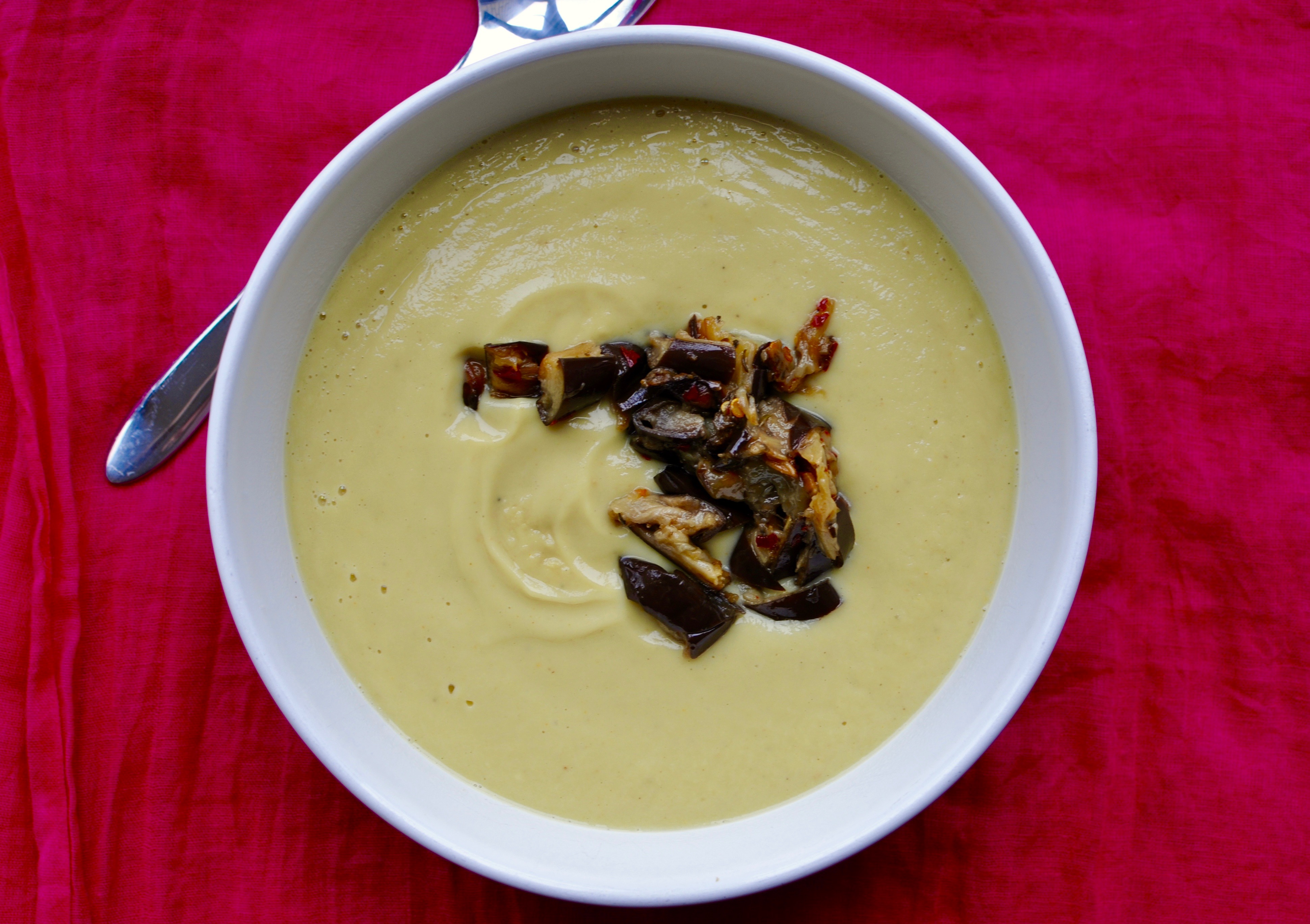 - Heat the soup over low heat until nice and hot, being careful not to let it boil. Serve in a shallow bowl with the marinated eggplant strewn across the surface.