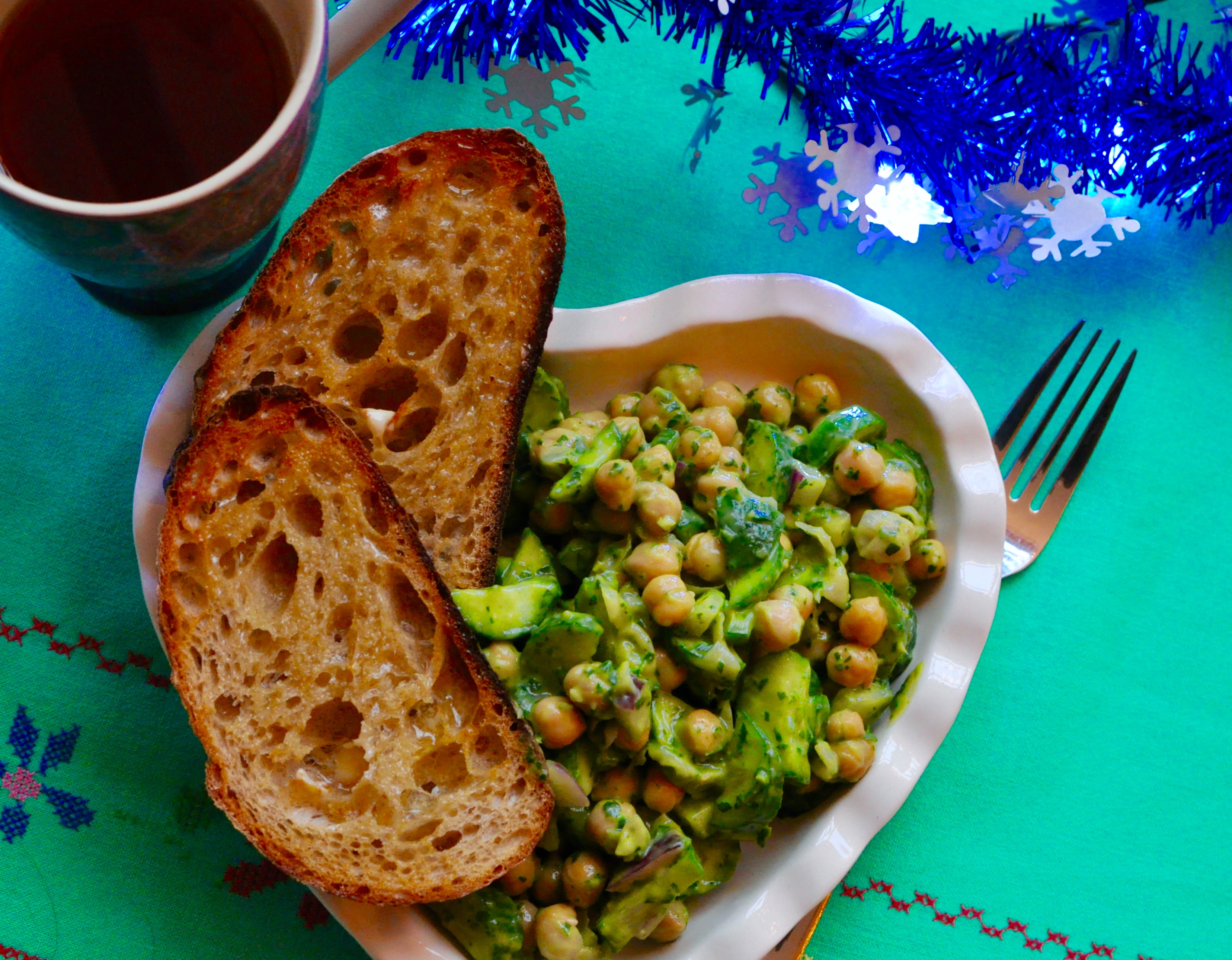 This is a bright and immensely flavourful variation on a chickpea salad, ideal for eating with a loaf of buttered sourdough toast from Batard Bakery in Vancouver (kindly gifted by one of our guests over the weekend at the cocktail party Ian and I hosted). I went for a long walk on an empty stomach along Jericho Beach this afternoon to take pictures in the rain, and I was in full need of comfort and carbohydrates by the time I got home. I put this together in less than 10 minutes, leaving it to sit for about 15 minutes while I dried off and made a cup of Constant Comment tea (thank you again, to another guest at the party – I always have trouble finding this particular kind of tea). This chickpea salad would be wonderful in a warm pita with some extra dressing or tzatziki, I can imagine it would taste pretty wonderful alongside some cumin-rubbed lamb as either a hot meal or a cold spread that demands a thorough pick through. You can add more lemon juice if you’d like, the zest would also serve to brighten the taste of the dressing even further. A pinch of cayenne wouldn’t be remiss here, nor would some barely blanched broccoli florets and toasted sunflower seeds.