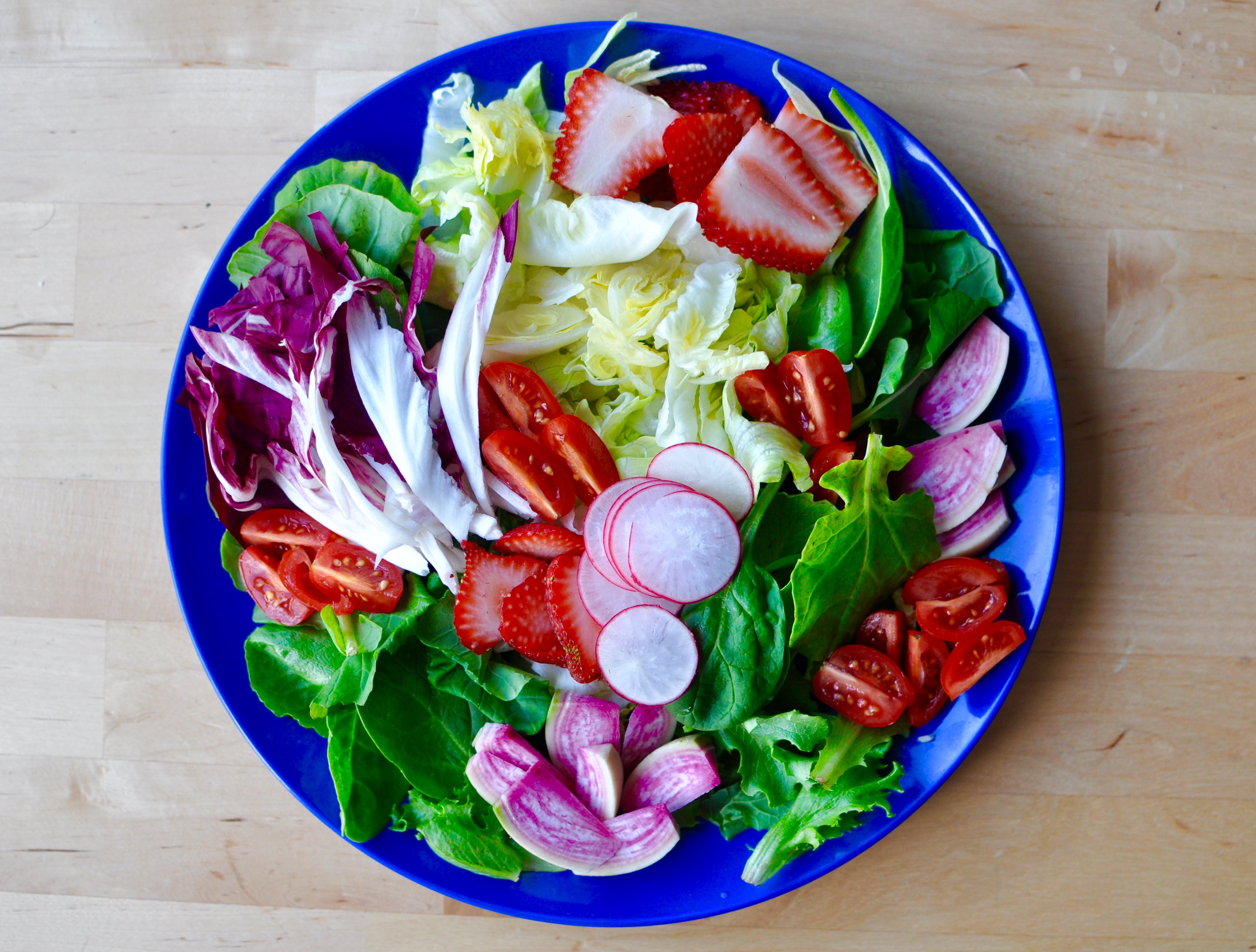 I spent my day eating hot cross buns and hearty lentil salad so a light supper was in order. This bright salad is made of baby greens, iceberg lettuce, radicchio, egg and watermelon radishes, grape tomatoes, and strawberries and it was tossed with a sherry vinegar and honey vinaigrette.