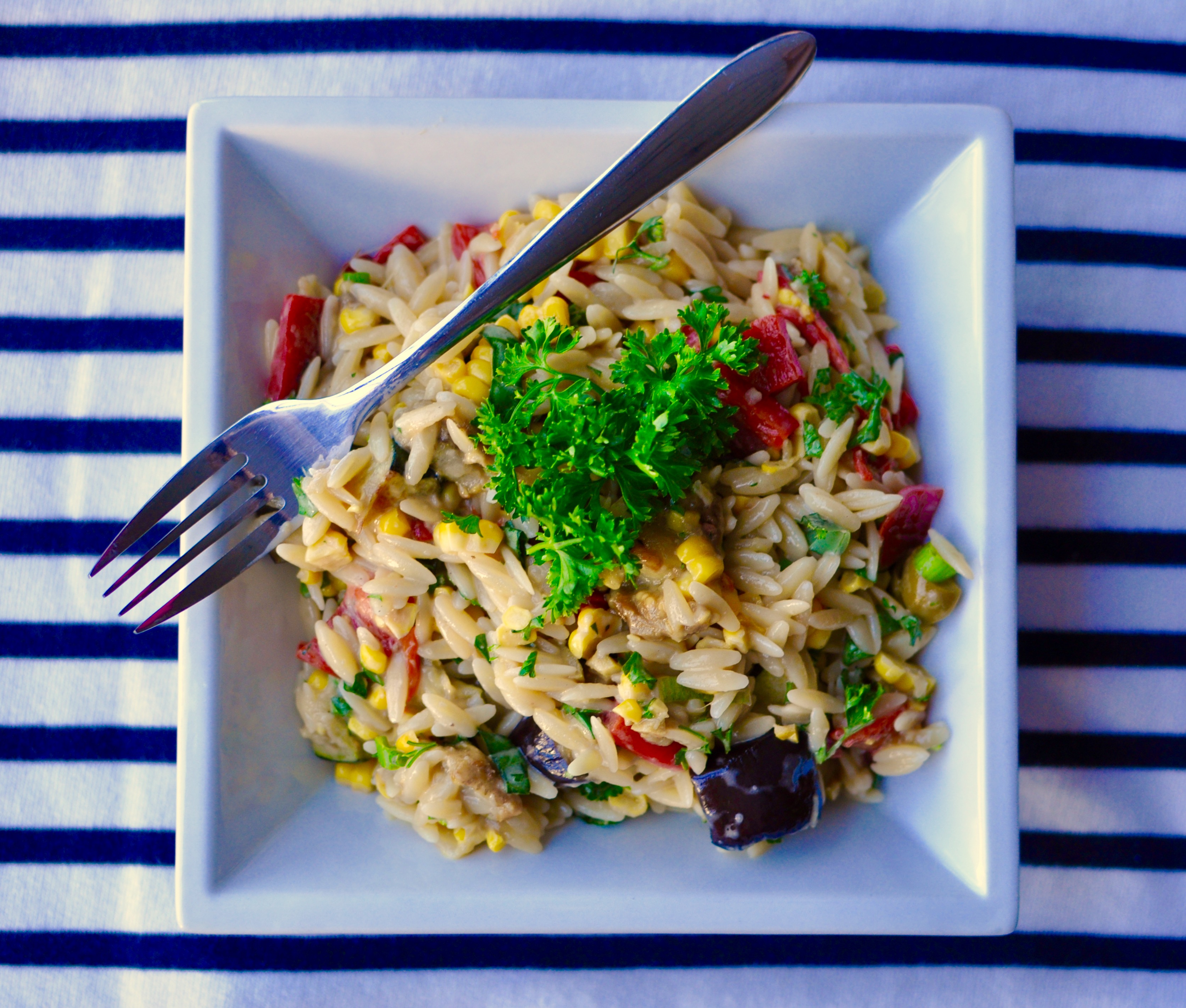 - Dice the marinated roasted red peppers and add to the orzo. Stir in the corn, eggplant, zucchini, scallions, green olives, fresh basil, and parsley. Toss the mixture with the dressing, stirring thoroughly so that the pasta and vegetables are completely coated. Add plenty of freshly cracked pepper and salt to taste before allowing to sit 15 minutes before serving.