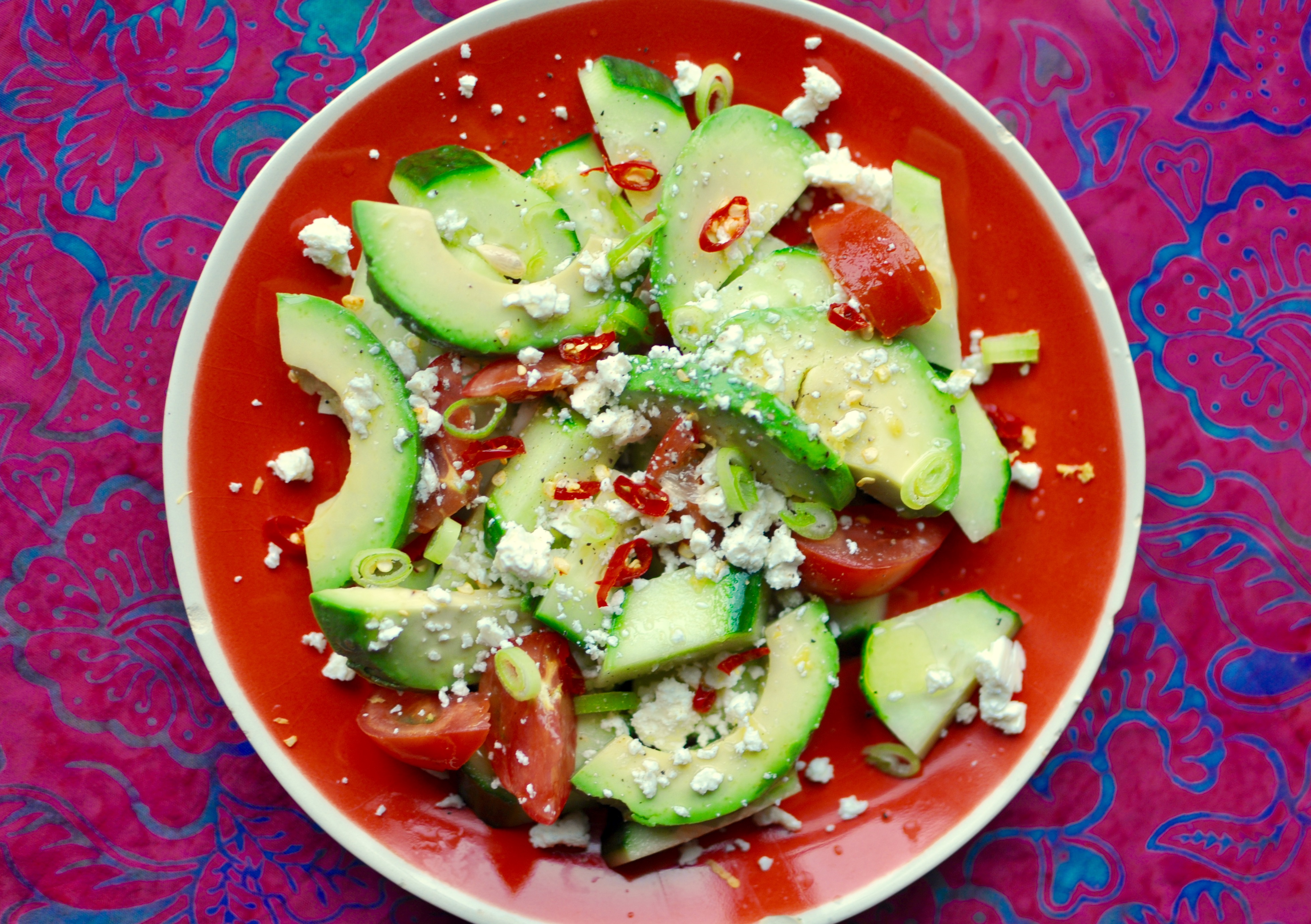 cucumber, tomato, and avocado salad with lemon, feta, and chilies: